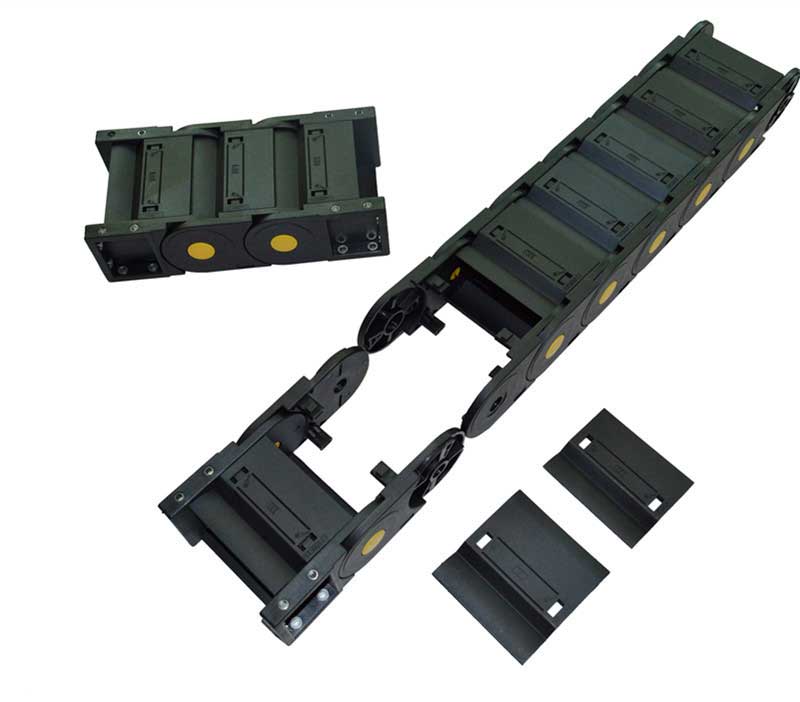 全封閉塑料拖鏈采用可拆卸的橋式接件,從頂部和底部快速鉤住和取下鉤子,所有中心都有橋梁。